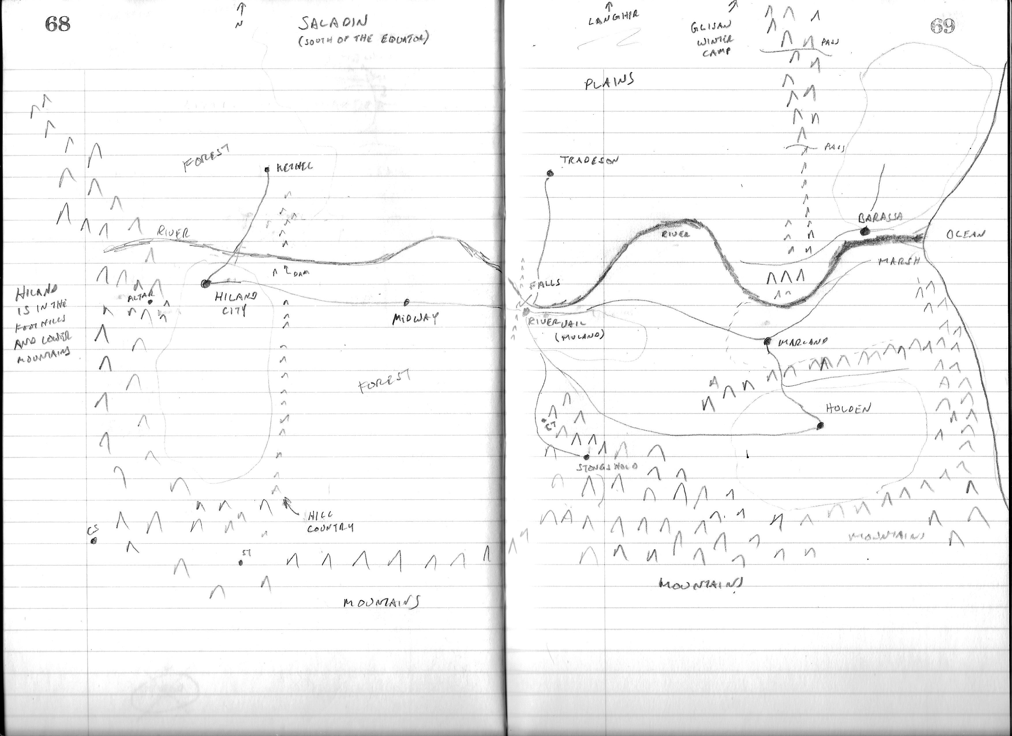 Hiland is in the southern hemisphere, well south of the equator. The country to the south is very mountainous, there are some city-states and small independent towns in the mountains. This map isn't exactly to scale, it's a redraw of a smaller one that I've been using, which is a lot cruder.