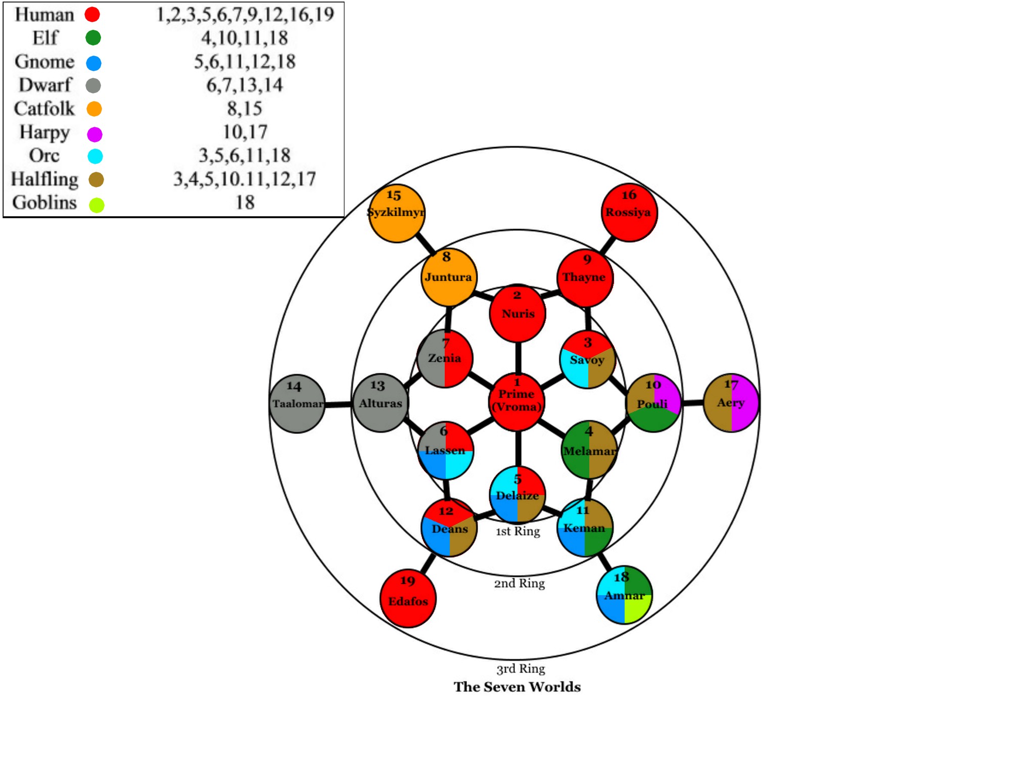 This shows how all of the nineteen worlds of what has become known as the 'Seven Worlds' interconnect. It also shows the predominate races on each of those worlds - but it doesn't mean other races can not be on those worlds. It is by no means all-inclusive either.